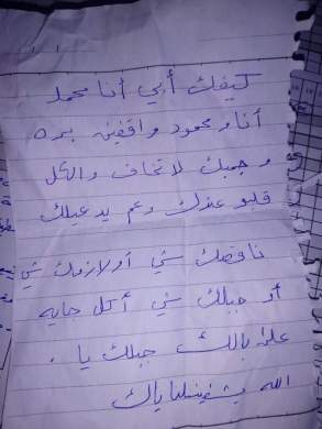 ونقلت صفحة “سماعة حكيم” التي يديرها أطباء من دمشق، على موقع “فيس بوك”، صور لرسالة كتبها أحد الأشخاص على بوابة المستشفى وأعطاها لأحد الأطباء لإدخالها إلى والده الذي يخضع للعناية في مركز العزل بعد إصابته بفيروس كورونا.