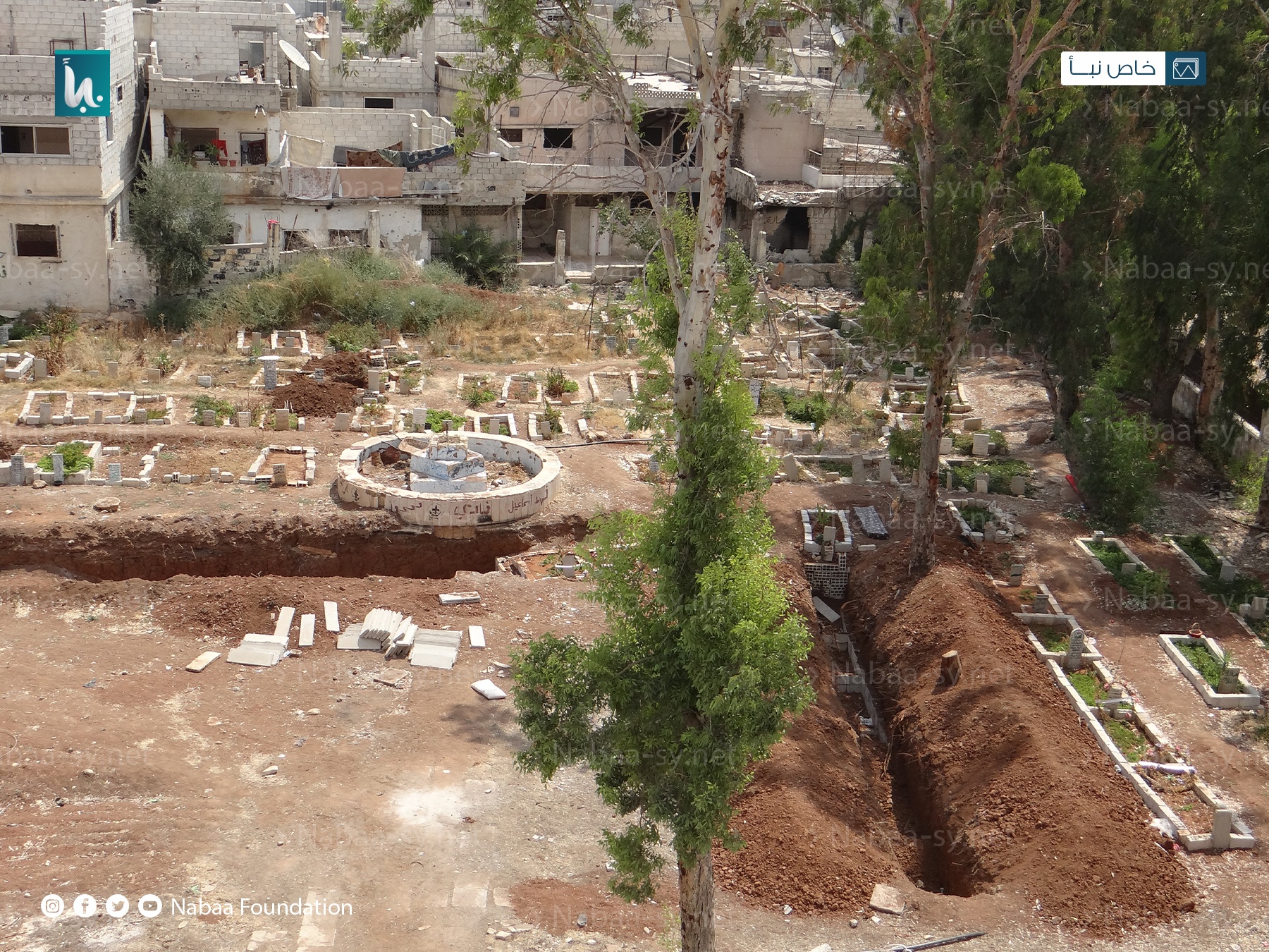 كانت حديقة مخيم اللاجئين الفلسطينيين أول مقبرة مستحدثة في المدينة (عام 2012) عندما أُجبر الأهالي على دفن قتلاهم فيها بعد تعذّر دفنهم في مقبرة البحار الرئيسية بسبب التواجد العسكري وحصار المنطقة، سبق ذلك عمليات دفن في حدائق المنازل خلال هجمات قوات النظام وحصارها للأحياء في مناطق عدة بالمحافظة.